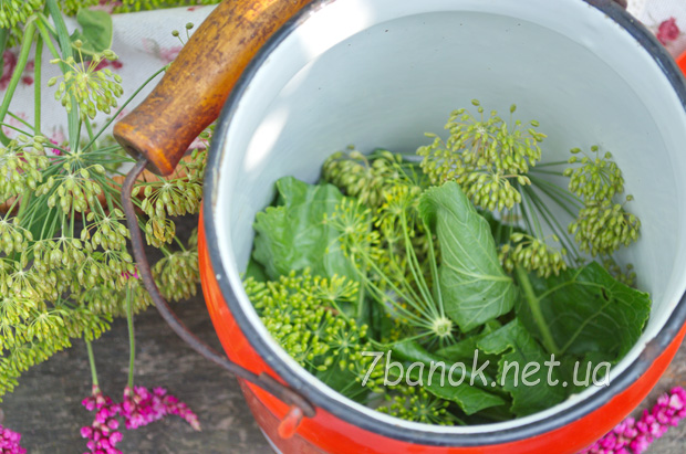 Дуже бажано, щоб каструля була високою і з кришкою. На дно каструлі поміщаємо парасольки кропу, листя хрону, часник і шматочок гострого перцю.