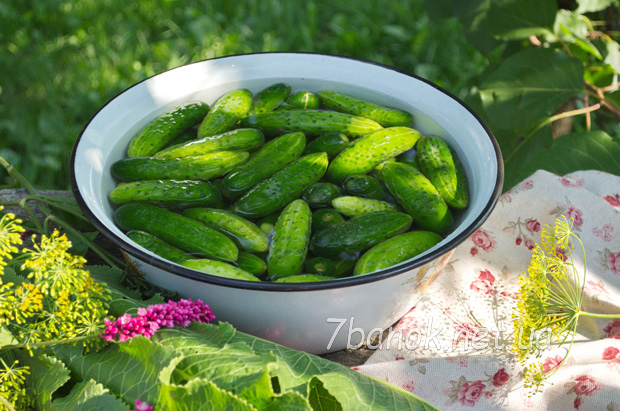 Приготування починаємо із замочування огірків. Заздалегідь (за 2-3 години) поміщаємо огірки в холодну проточну воду. Огірки «візьмуть» вологу, якої бракує, і в готовому вигляді вийдуть дуже хрусткими та соковитими.