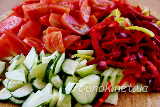Овочі ретельно промиваємо в проточній воді. Огірки, помідори і болгарський перець відбираємо тільки свіжі, не прим’яті без зовнішніх ушкоджень.