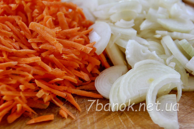 Цибулю очищаємо, вирізаємо прикореневе донце і знову промиваємо. Нарізаємо цибулю півкільцями завтовшки 3-5 мм. Моркву очищаємо від шкірки, обполіскуємо. Натираємо моркву на великій тертці.