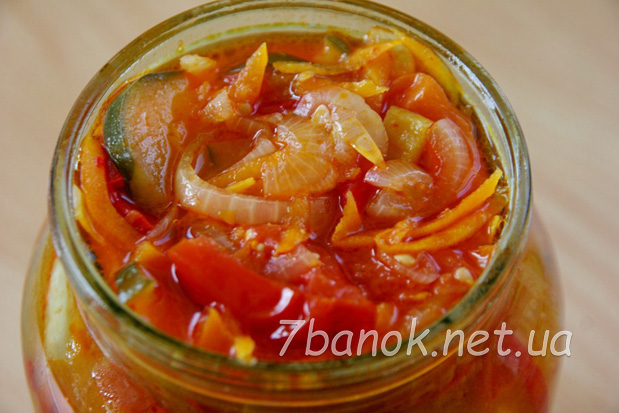 Гарячий салат розкладаємо по гарячих, витертих насухо, простерилізованих банках.