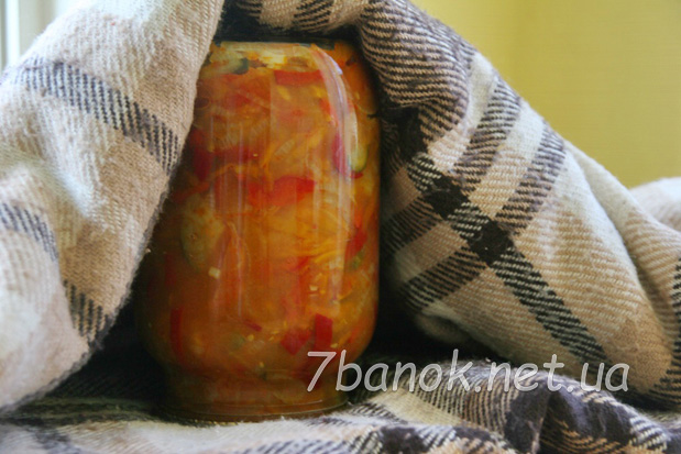 Банки з салатом герметично закатуємо (або загвинчуємо) кришками і перевертаємо догори дном. Укутуємо банки ковдрою і залишаємо так на добу, до повного охолодження.