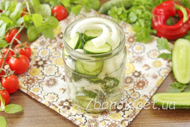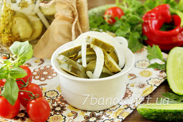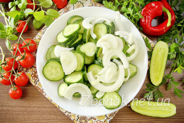 Огірки нарізаємо кільцями завтовшки 4-5 мм. Цибулю очищаємо від лушпиння та промиваємо. Нарізаємо цибулю півкільцями (велику – чверть – кільцями) товщиною 3-5 мм.