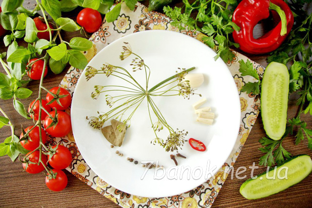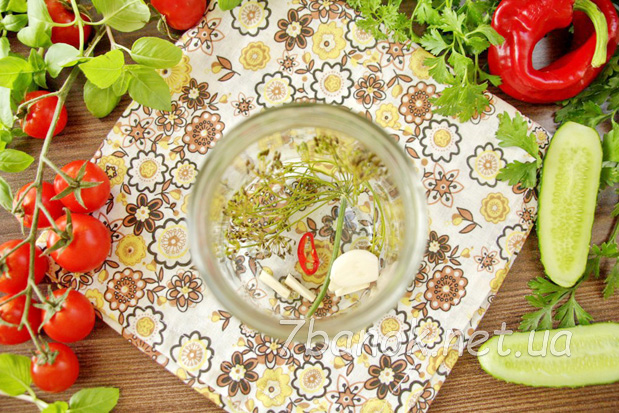 На дно заздалегідь простерилізованих банок кладемо кріп, часник, корінь хріну, гострий перець, горошини чорного і запашного перців.