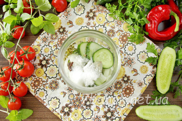 На огірки з цибулею насипаємо цукор і сіль, кладемо лавровий лист, гвоздику і коріандр, наливаємо оцет.