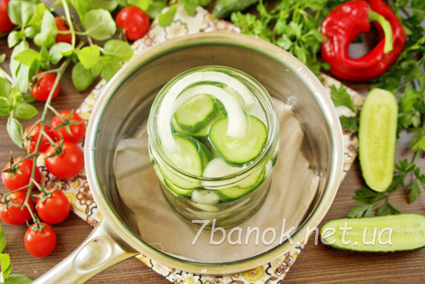 І ставимо в каструлю, дно якої вистелене серветкою. Заливаємо банки з салатом теплою водою так, щоб вода трохи не доходила до шийок банок. Прикриваємо банки прокип’яченими кришками. На сильному вогні доводимо воду в каструлі до кипіння. Стерилізуємо, зменшивши нагрів, протягом 10 хвилин.