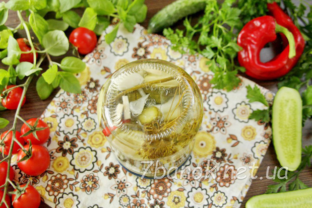 Після стерилізації банки із салатом одразу герметично закупорюємо й перевертаємо догори дном, витримуємо так до повного охолодження.