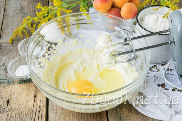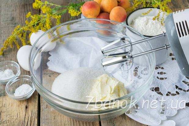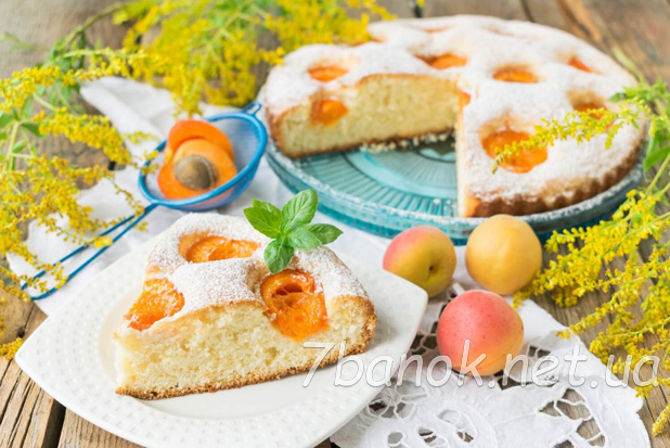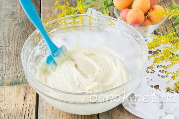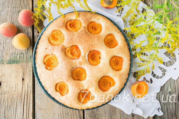 Досить змішати всі інгредієнти міксером, викласти тісто у форму і доповнити його половинками свіжих абрикосів.