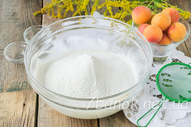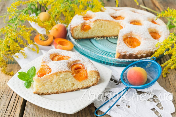Готовий пиріг трохи остудити й акуратно перекласти на плоске блюдо. За допомогою ситечка прикрасити абрикосовий пиріг цукровою пудрою.