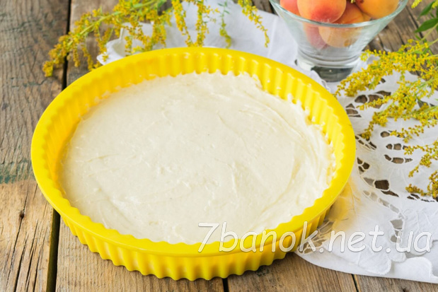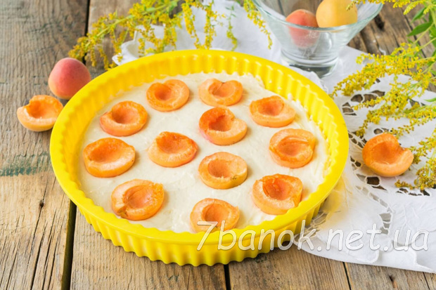 Свіжі абрикоси вимити й обсушити, видалити кісточки. Викласти половинки фруктів на тісто, злегка втоплюючи в ньому абрикоси.